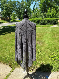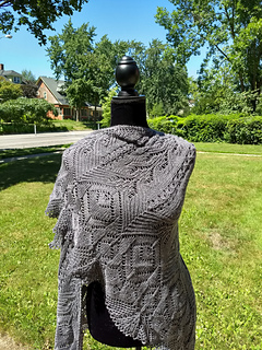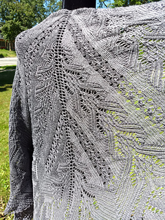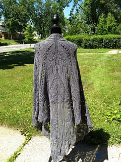 This is a pattern from a series inspired by LOTR (the movie, I'm pretty sure and not the books.)  The yarn is this lovely, lustrous grey, it's a wool-silk blend.  The shawl itself is, as  you can see, large.  Downright luxurious.  It was a very complex pattern, with a lot of twisted stitches, which gives it a really beautiful stitch definition.  I'm entering it into the State Fair, so I can't mail it to you until after that.